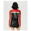 Make a bold statement with this red and black leather biker jacket for women. Designed with striking color contrast and a sleek fit, it combines durability with a modern edge for versatile styling.