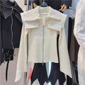 This black zip up knit jacket with wide collar for women is designed for those who love bold and modern fashion. The structured shoulders and unique collar detailing make it a standout piece that blends comfort with contemporary streetwear style.